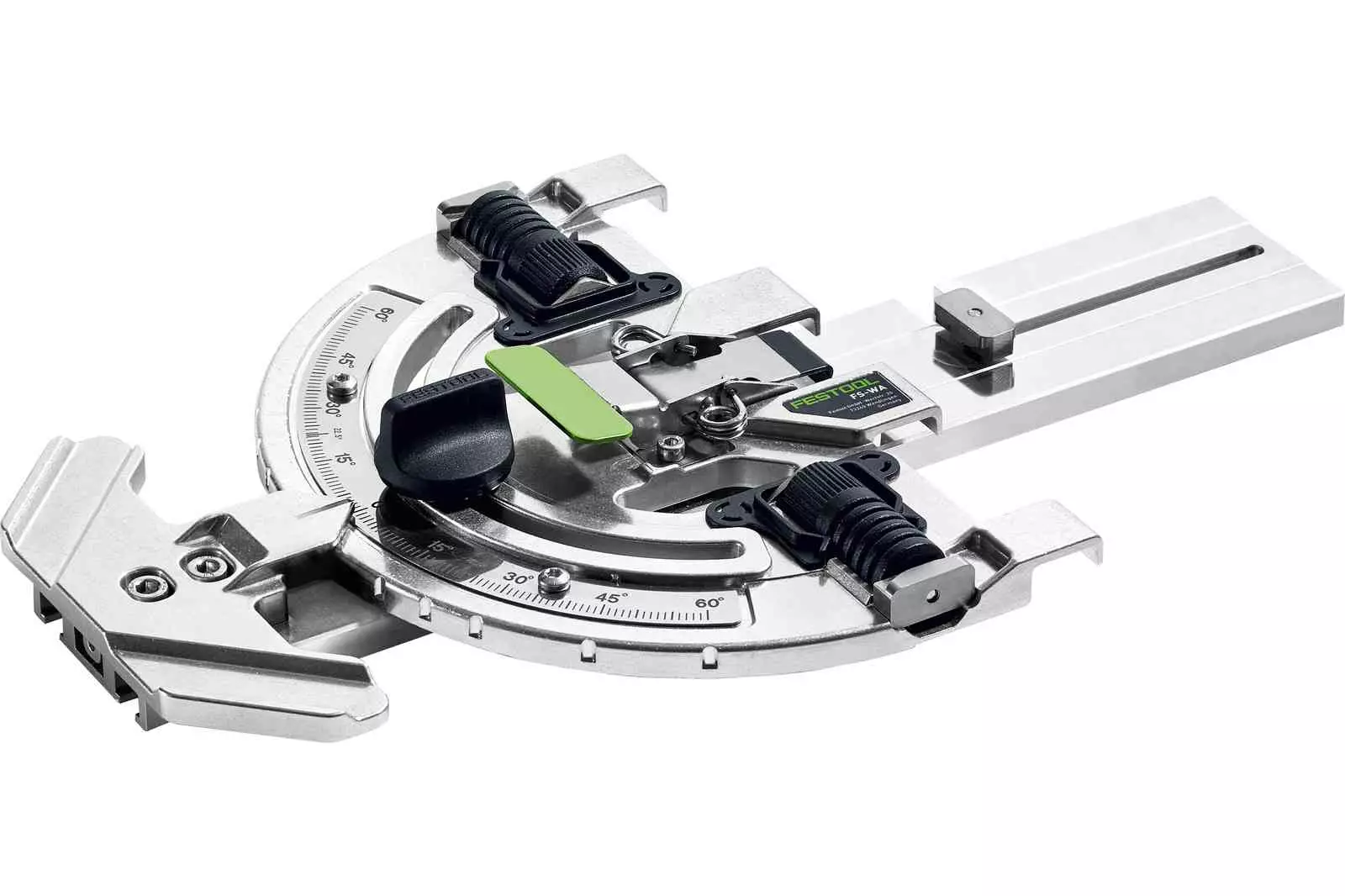 Kulmaohjain ohjainkiskolle – tarkkoihin ja nopeisiin kulmasahauksiin. -60...+60° kulmat voi säätää toistotarkasti ja erittäin täsmällisesti. Kulmaohjain tarjoaa siten monipuoliset ja joustavat käyttömahdollisuudet. Kulmaohjaimen voi kiinnittää käden käänteessä pikapuristimella ohjainkiskoon ja se muodostaa yhdessä käsipyörösahan sekä saha- ja työpöydän kanssa mukana kuljetettavan levysahan. Suunniteltu tarkasti ohjattavaan kulmasahaamiseen.