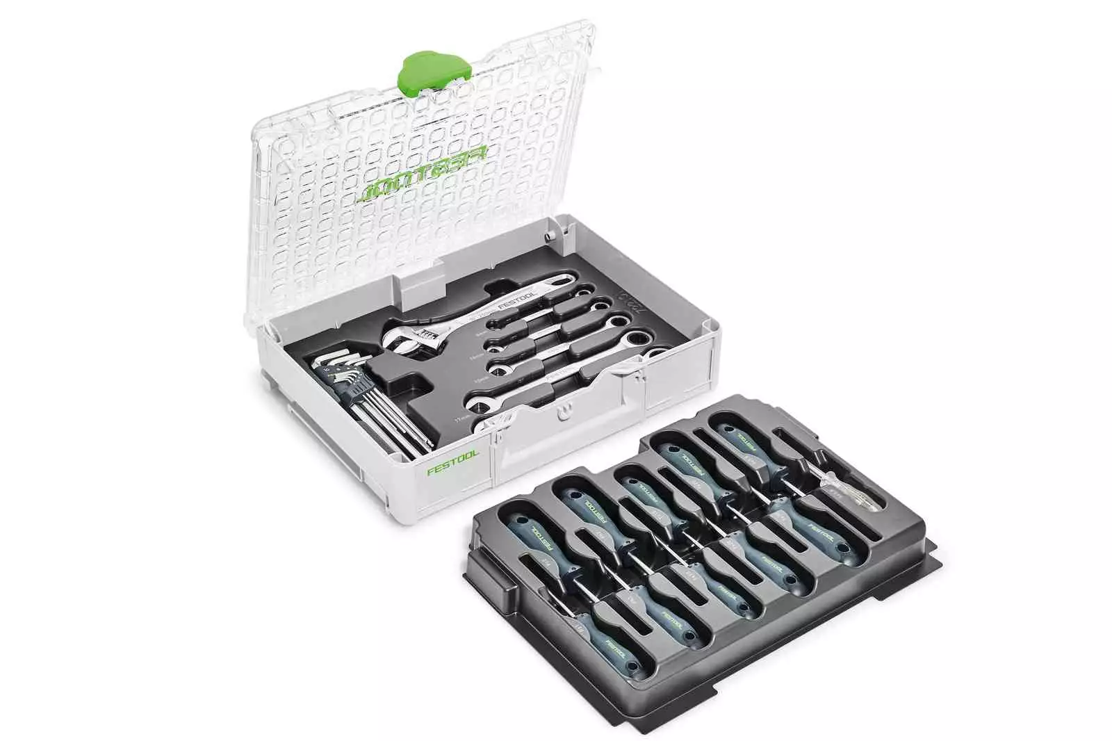 Ruuvitaltta (SD PZ 1, PZ 2, PH 1, PH 2, TX 10, TX 15, TX 20, Tx25, TX 30, SZ 5,5x1,0), vaihetesteri SZ 3,0x0,8, räikkälenkkiavaimet, avainkoot: 8, 10, 13, 17 ja 19, 72-hampainen räikkämekanismi, paluukulma: 5°, lenkkiasento 15°, kuusiokoloavaimet: 2 mm, 2,5 mm, 3 mm, 4 mm, 5 mm, 6 mm, 8 mm, 10 mm, Jakoavain (RGS maks. 34 mm)