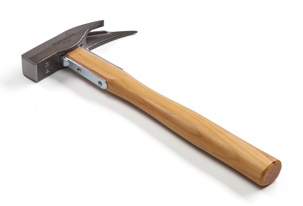 Vahva kirvesmiehen vasara, jossa piikki ja nelikulmainen lyöntipinta. Varsi on kiinnitetty päähän kahdella teräskiskolla.