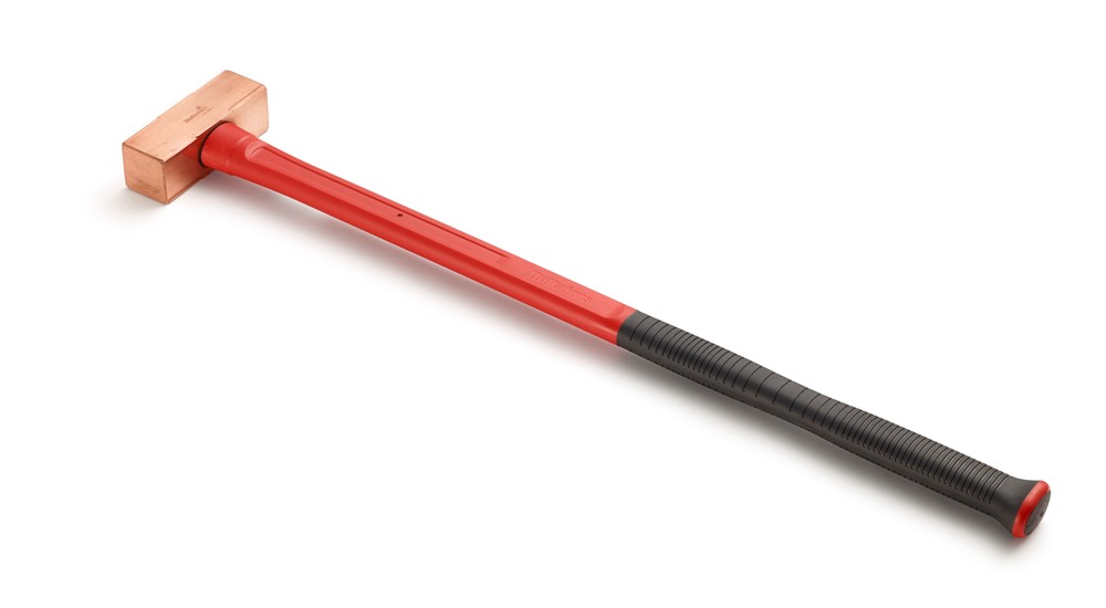 Kuparipäinen vasara, varsi lasikuitua. Kuparivasara ei kipinöi, ja se käsittelee työkappaletta hellävaraisesti.