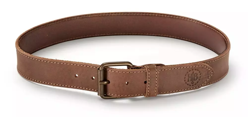 Ruskea nahkavyö, johon on kaiverrettu Hults Brukin klassinen logo.