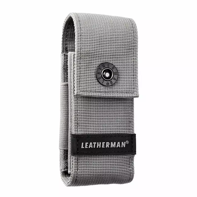 Harmaa Leatherman nylonkotelo, jossa kätevät joustavat kiinnityslenkit molemmilla sivuilla lisävarusteiden, kuten Bit Kit -vaihtokärkisarjojen kuljetukseen. Tämä malli sopii esimerkiksi ARC Charge+ Signal Super Tool 300 Super Tool 300 EOD Super Tool 300M ja Surge -monitoimityökaluille.