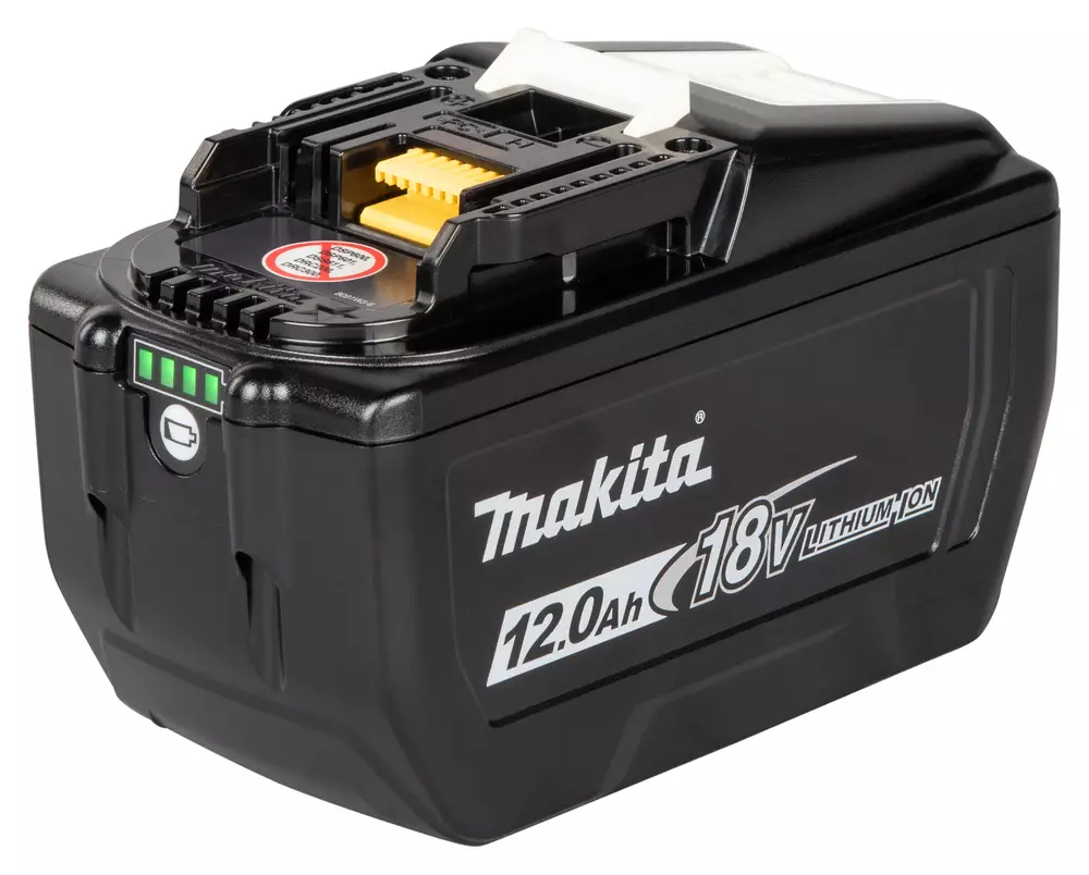 Varaustilannäytöllä varustettu Makitan 12,0 Ah Li-ion akku. Erityisen hyvä käytettäessä paljon virtaa vaativia koneita. Ei kuitenkaan optimaalinen pienempien koneiden kanssa fyysisen kokonsa takia. Akun latausaika pikalatauslaitteella on noin 120 minuuttia.