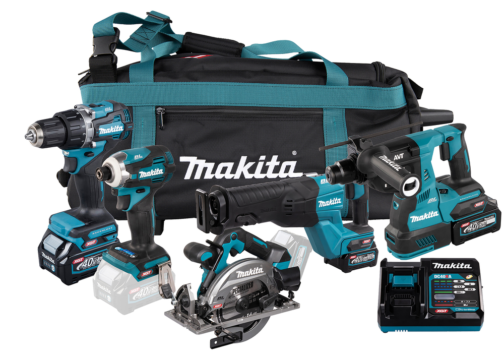 Viiden koneen 40V XGT akkutyökalusarja esimerkiksi rakennustyömaalle. Sisältää porakoneen DF002G, iskevän ruuvinvääntimen TD001G, puukkosahan JR001G, pyörösahan HS012G ja poravasaran HR003G sekä kaksi 4,0Ah akkua ja yhden 2,5Ah akun. Sarjaan kuuluu lisäksi pikalatauslaite DC40RA ja kätevä työkalukassi pyörillä koneiden säilytystä ja kuljetusta varten.