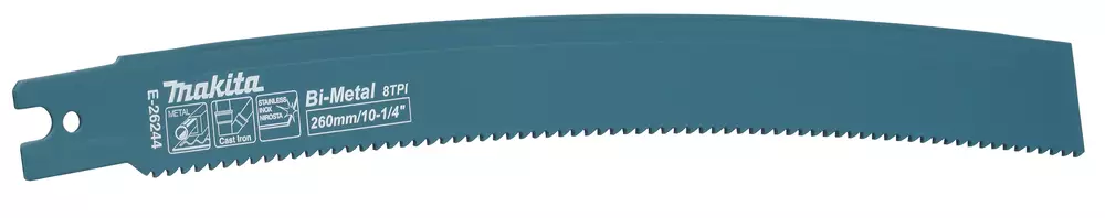 Kaareva puukkosahanterä metallin, valuraudan ja RST:n katkaisuun. Kokonaispituus 260 mm. Paksuus 1,6 mm ja 8 TPI. Paketissa 5 kpl teriä. Poikkeavan kiinnityksen vuoksi terä on tarkoitettu käytettäväksi erityisesti Makita JR003G ketjulisälaitteella varustetussa puukkosahassa.