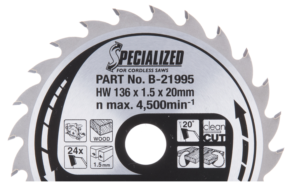 Specialized pyörösahanterä 136mm halkaisijalla ja Z-24 hammastuksella puun sahaamiseen. Terä jättää siistin sahausjäljen ja soveltuu akkukäyttöisillä käsipyörösahoilla käytettäväksi. Terän hampaan leveys 1,5mm ja reiän halkaisija 20mm. Esim. Malleille: DSS501