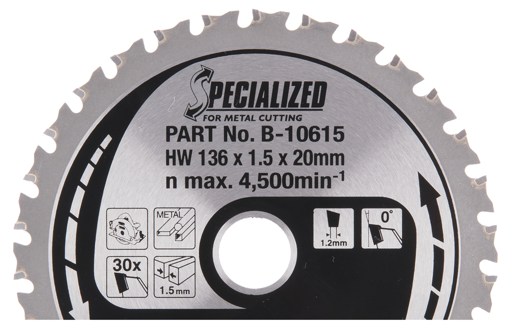 MAKITA B-33526 / B-10615 Specialized pyörösahanterä 136mm halkaisijalla ja Z-30 hammastuksella metallin sahaamiseen. Terä soveltuu akkukäyttöisillä metallikäsipyörösahoilla käytettäväksi. Terän hampaan leveys 1,5mm ja reiän halkaisija 20mm. Esim. malleille DCS550, DCS552
