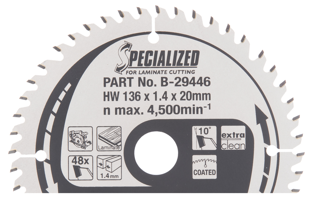 Specialized pyörösahanterä 136mm halkaisijalla ja Z-48 hammastuksella laminaatin sahaamiseen. Terä jättää erittäin siistin sahausjäljen ja soveltuu akkukäyttöisillä käsipyörösahoilla käytettäväksi. Terän hampaan leveys 1,4mm ja reiän halkaisija 20mm. Esim. malleille DSS501