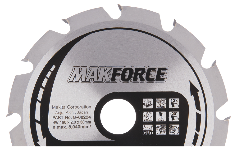 Käsipyörösahat Esim. malleille: DHS710, DHS782, DHS783, HS7601, HS7611Makforce pyörösahanterä 190mm halkaisijalla ja Z-12 hammastuksella puun nopeaan sahaamiseen. Terä jättää karkean sahausjäljen ja soveltuu käsipyörösahoilla käytettäväksi. Terän hampaan leveys 2,0mm ja reiän halkaisija 30mm.