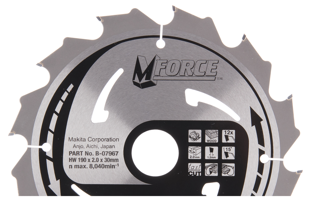 MAKITA B-31974 / B-07967 Kestävä M-Force pyörösahanterä 190mm halkaisijalla ja Z-12 hammastuksella nopeaan puun sahaamiseen. Nopeasta katkaisusta huolimatta terä jättää siistin sahausjäljen. Terä soveltuu käsipyörösahoilla käytettäväksi. Hampaan leveys 2mm ja reiän halkaisija 30mm. Esim. malleille: DHS710, DHS782, DHS783, HS7601, HS7611