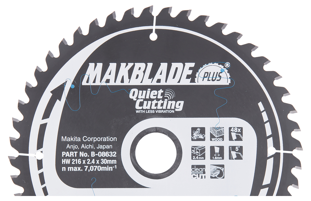 Jiirisahat Esim. malleille LS0815Erittäin hiljainen, kestävä sekä alhaisen tärinän 216mm Makblade Plus pyörösahanterä Z-48 hammastuksella yleiskäyttöön puun sahaamiseen. Terä soveltuu katkaisu- ja jiirisahoilla käytettäväksi. Terän hampaan leveys 2,4mm ja reiän halkaisija 30mm.