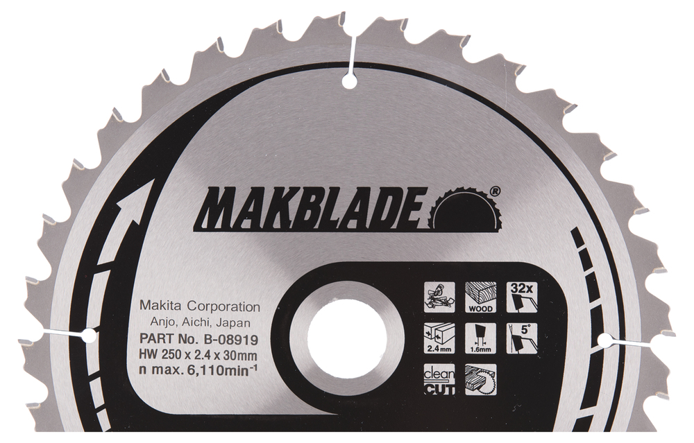 MAKITA B-08919 Makblade pyörösahanterä 250mm halkaisijalla ja Z-32 hammastuksella puun nopeaan sahaamiseen. Terä soveltuu pöytä- sekä jiirisahoilla käytettäväksi. Terän hampaan leveys 2,3mm ja reiän halkaisija 30mm