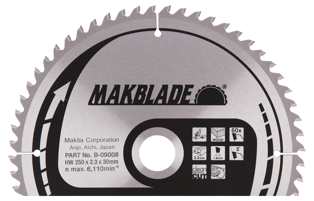 MAKITA B-09008 Makblade pyörösahanterä 250mm halkaisijalla ja Z-60 hammastuksella puun hienoon sahaamiseen. Terä jättää siistin sahausjäljen ja soveltuu pöytä- sekä jiirisahoilla käytettäväksi. Terän hampaan leveys 2,3mm ja reiän halkaisija 30mm.
