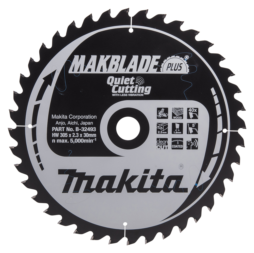 Pöytä- ja jiirisahat Esim. malleille LS1219, LH1201, DLS211Erittäin hiljainen, kestävä sekä alhaisen tärinän 305mm Makblade Plus pyörösahanterä Z-40 hammastuksella puun nopeaan sahaamiseen. Terä soveltuu pöytä- sekä jiirisahoilla käytettäväksi. Terän hampaan leveys 2,3mm ja reiän halkaisija 30mm.