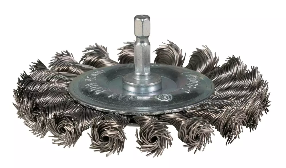 Punottu 100 mm leveä laikkaharja 0,50 mm paksuisella ruostumattomalla teräslangalla materiaalien ja esim. ruosteen poistoon. 1/4" kuusiokantakiinnitys porakoneille ja iskeville ruuvinvääntimille.