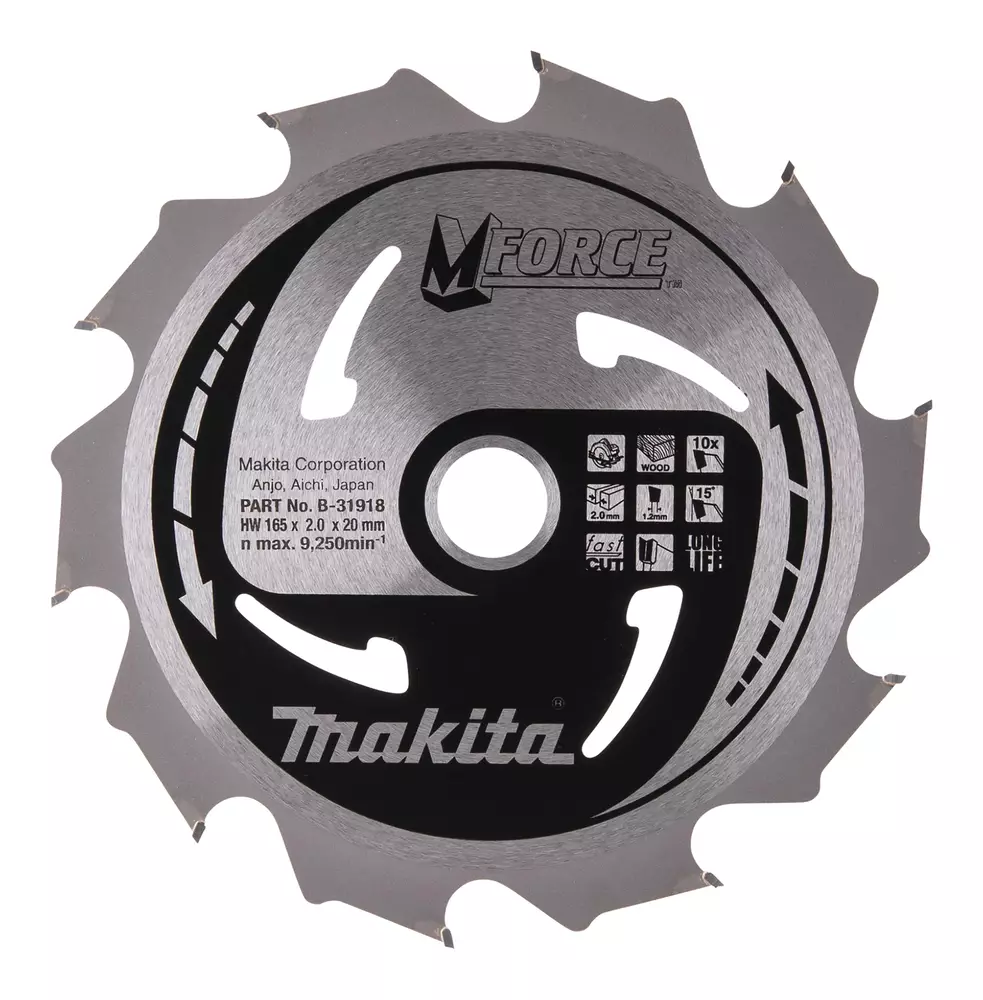 MAKITA B-31918 / B-07886 Kestävä M-Force pyörösahanterä 165mm halkaisijalla ja Z-10 hammastuksella nopeaan puun sahaamiseen.