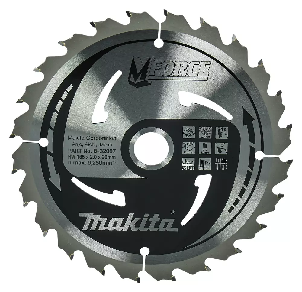 MAKITA B-32007 / B-08006 Kestävä M-Force pyörösahanterä 165mm halkaisijalla ja Z-24 hammastuksella puun sahaamiseen. Terä jättää keskihienon sahausjäljen ja soveltuu käsipyörösahoilla käytettäväksi. Terän hampaan leveys 2,0mm ja reiän halkaisija 20mm. Sähköpyörösahoille Esim. malleille: HS6101, HS6601