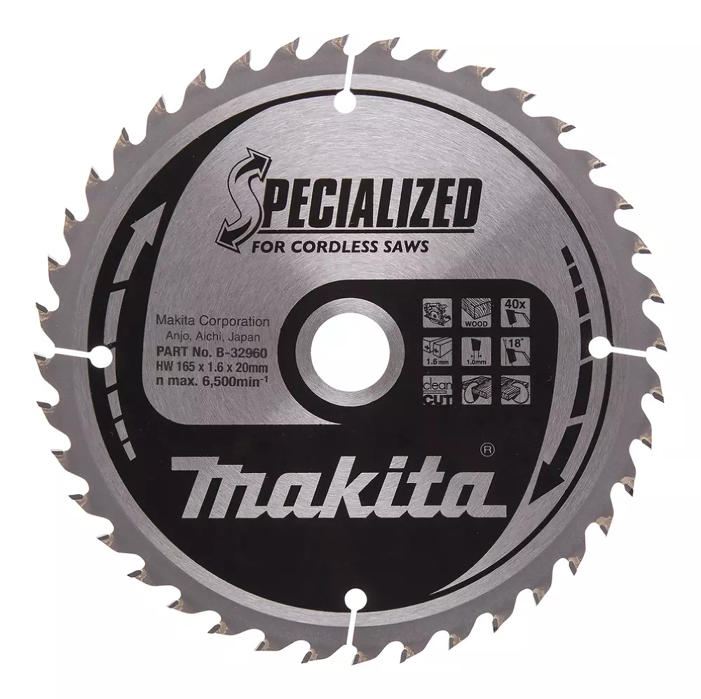 MAKITA B-32960 Specialized pyörösahanterä 165mm halkaisijalla ja Z-40 hammastuksella puun sahaamiseen.