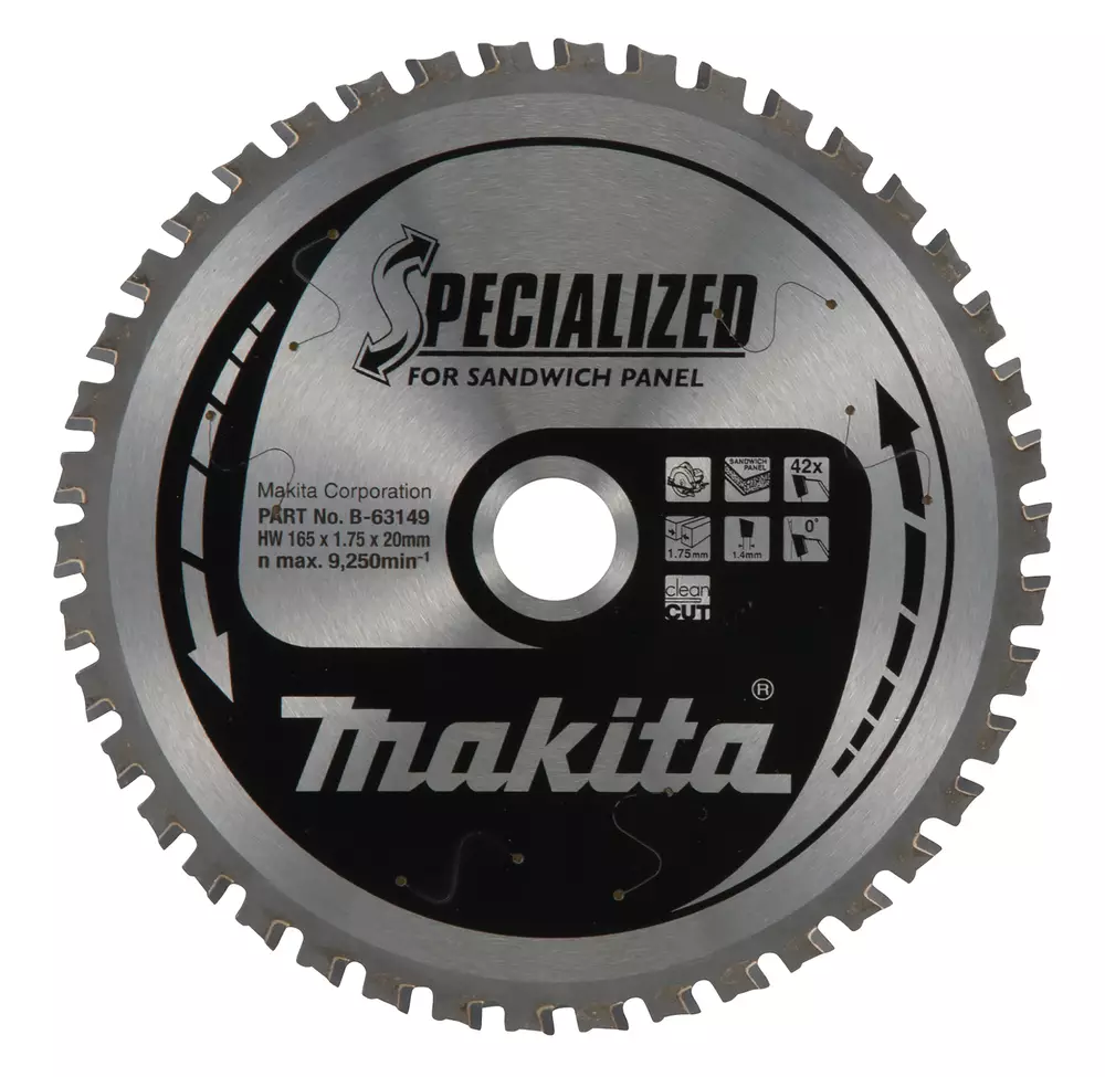 Specialized pyörösahanterä 165mm halkaisijalla ja Z-42 hammastuksella Sandwich elementin sahaamiseen. Terä soveltuu käsipyörösahoilla käytettäväksi. Terän hampaan leveys 1,75mm ja reiän halkaisija 20mm.