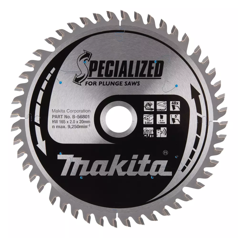 Upotuspyörösahat DSP600, DSP601, SP600Specialized pyörösahanterä 165mm halkaisijalla ja Z-48 hammastuksella Corian levyn sahaamiseen. Terä soveltuu upotuspyörösahoilla käytettäväksi. Terän hampaan leveys 2,0mm ja reiän halkaisija 20mm