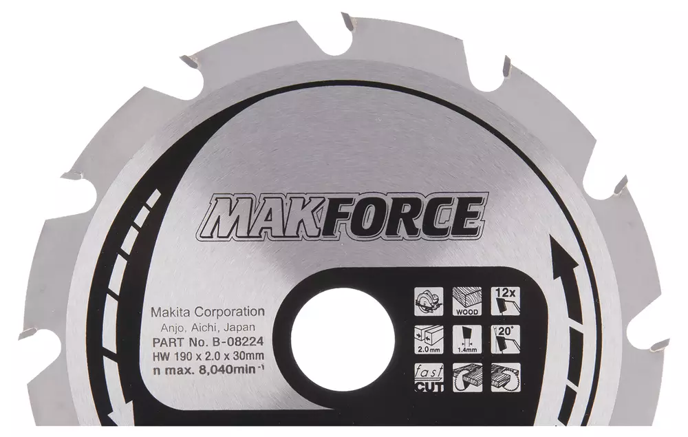 Käsipyörösahat Esim. malleille: DHS710, DHS782, DHS783, HS7601, HS7611Makforce pyörösahanterä 190mm halkaisijalla ja Z-12 hammastuksella puun nopeaan sahaamiseen. Terä jättää karkean sahausjäljen ja soveltuu käsipyörösahoilla käytettäväksi. Terän hampaan leveys 2,0mm ja reiän halkaisija 30mm.