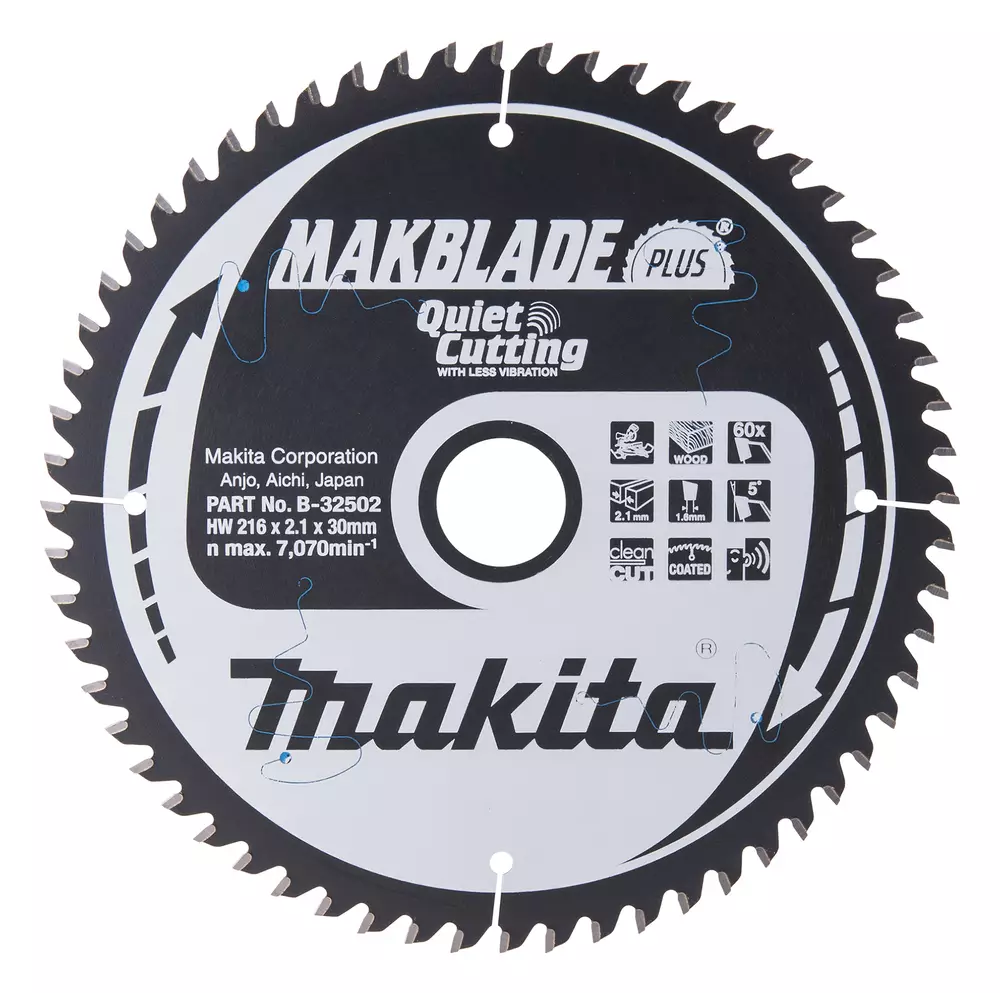 MAKITA B-32502 / B-08676 Erittäin hiljainen, kestävä sekä alhaisen tärinän 216mm Makblade Plus pyörösahanterä Z-60 hammastuksella puun hienoon sahaamiseen.