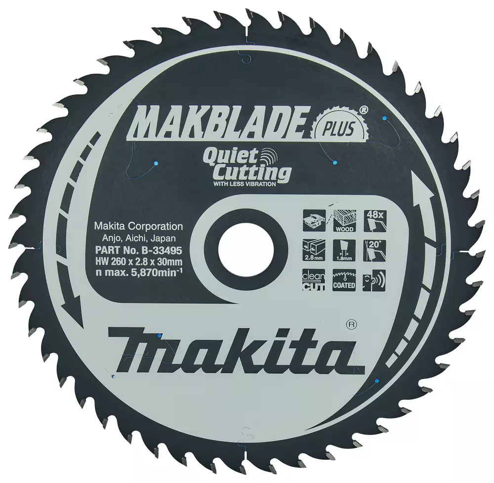 Pöytä- ja jiirisahat Esim. malleille 2704N, LS1019, LS1040N, DLS111Erittäin hiljainen, kestävä sekä alhaisen tärinän 260mm Makblade Plus pyörösahanterä Z-48 hammastuksella puun sahaamiseen. Terä soveltuu yleiskäyttöön pöytä- sekä jiirisahoilla käytettäväksi. Terän hampaan leveys 2,8mm ja reiän halkaisija 30mm.