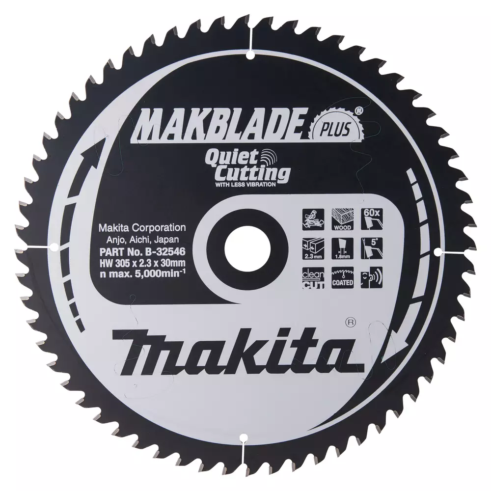Pöytä- ja jiirisahat Esim. malleille LS1219, LH1201, DLS211Erittäin hiljainen, kestävä sekä alhaisen tärinän 305mm Makblade Plus pyörösahanterä Z-60 hammastuksella puun hienoon sahaamiseen. Soveltuu yleissahaukseen pöytä- sekä jiirisahoilla käytettäväksi. Terän hampaan leveys 2,3mm ja reiän halkaisija 30mm.