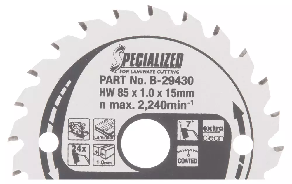AkkupyörösahatSpecialized pyörösahanterä 85mm halkaisijalla ja Z-24 hammastuksella laminaatin sahaamiseen. Terä jättää erittäin siistin sahausjäljen ja soveltuu akkukäyttöisillä käsipyörösahoilla käytettäväksi. Terän hampaan leveys 1,0mm ja reiän halkaisija 15mm. Esim. malleille HS301