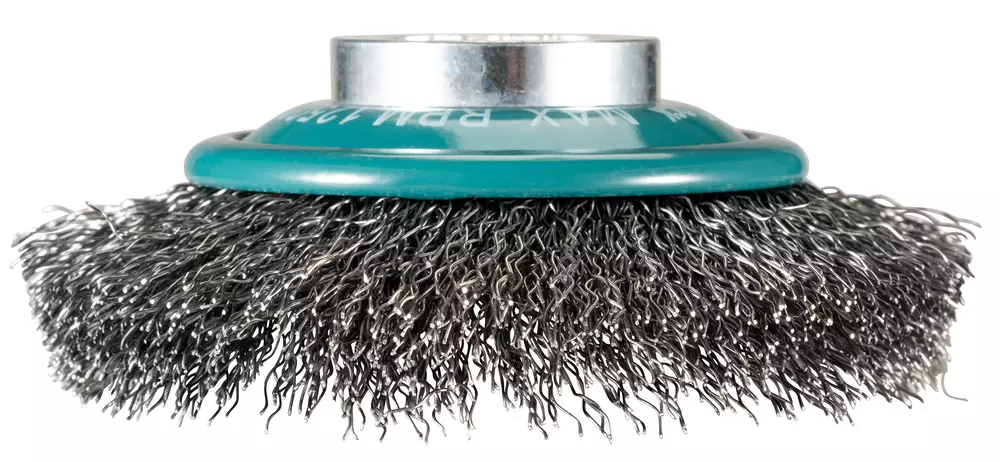 Kulmahiomakoneeseen suunniteltu 100 mm leveä viistetty kuppiharja, jossa on 0,3 mm paksuiset, poimutetut teräslangat.