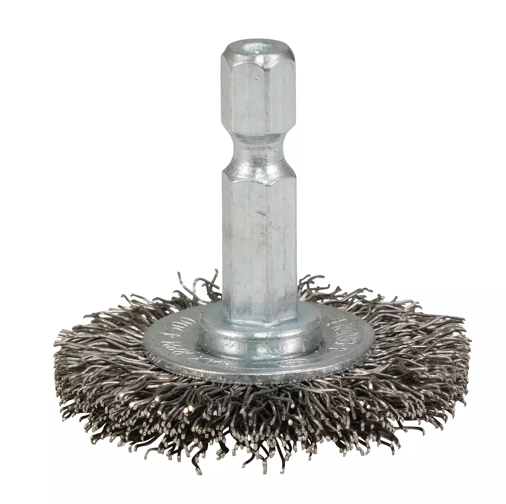 Poimutettu 38 mm leveä laikkaharja 0,30 mm paksuisella ruostumattomalla teräslangalla materiaalien ja esim. ruosteen poistoon. 1/4" kuusiokantakiinnitys porakoneille ja iskeville ruuvinvääntimille.