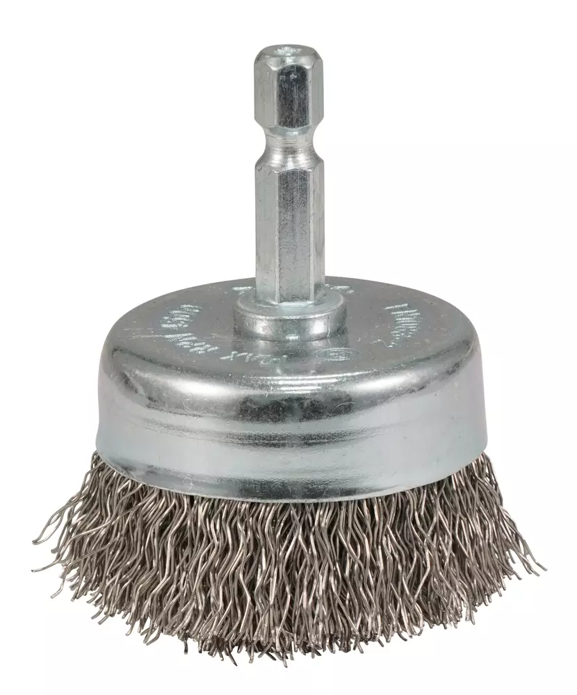 Poimutettu 50 mm leveä kuppiharja 0,30 mm paksuisella ruostumattomalla teräslangalla materiaalien ja esim. ruosteen poistoon. 1/4" kuusiokantakiinnitys porakoneille ja iskeville ruuvinvääntimille.