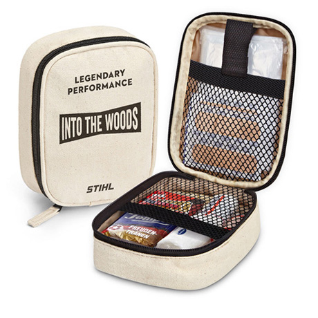Aina on järkevää varautua. Tässä Stihlin käytännöllisessä canvas-ensiapulaukussa on teipin ja laastarin, kiinnityssiteen ja nenäliinojen lisäksi pinsetit, sakset, kertakäyttökäsineet ja sadeponcho.