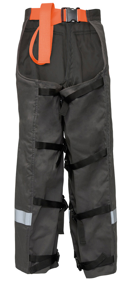 Muun suojavarustuksen päälle puettavat viiltosuojatut turvahousut esim. palomiehille tai linjaraivauksia suorittaville. Yksi koko, remmikiristys lahkeiden takana. Paloturvallisesti käsitellyt. 79 % puuvillaa, 20 % polyesteriä, 1 % staattinen sitovuus. 4/1 satiini, 350 g/m2. EN ISO 11612 / 11611 / 1149. 6-kerroksinen viiltosuojaus. Viiltosuojaluokka 2 (= 24 m/s), yksi koko.
