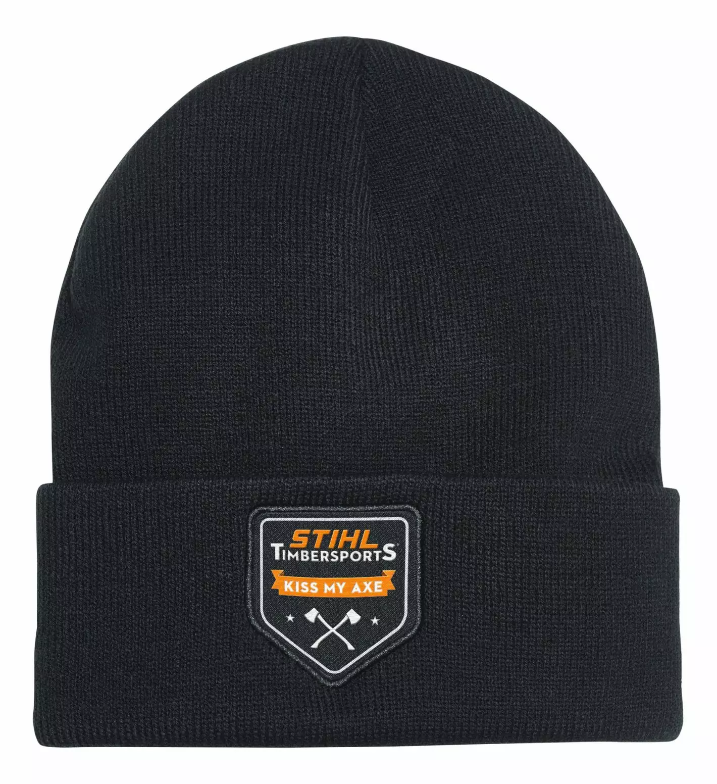 Yksinkertainen ja siisti musta pipo "KISS MY AXE" merkillä. Klassisella neulekuviolla varustettu pipo istuu optimaalisesti ja