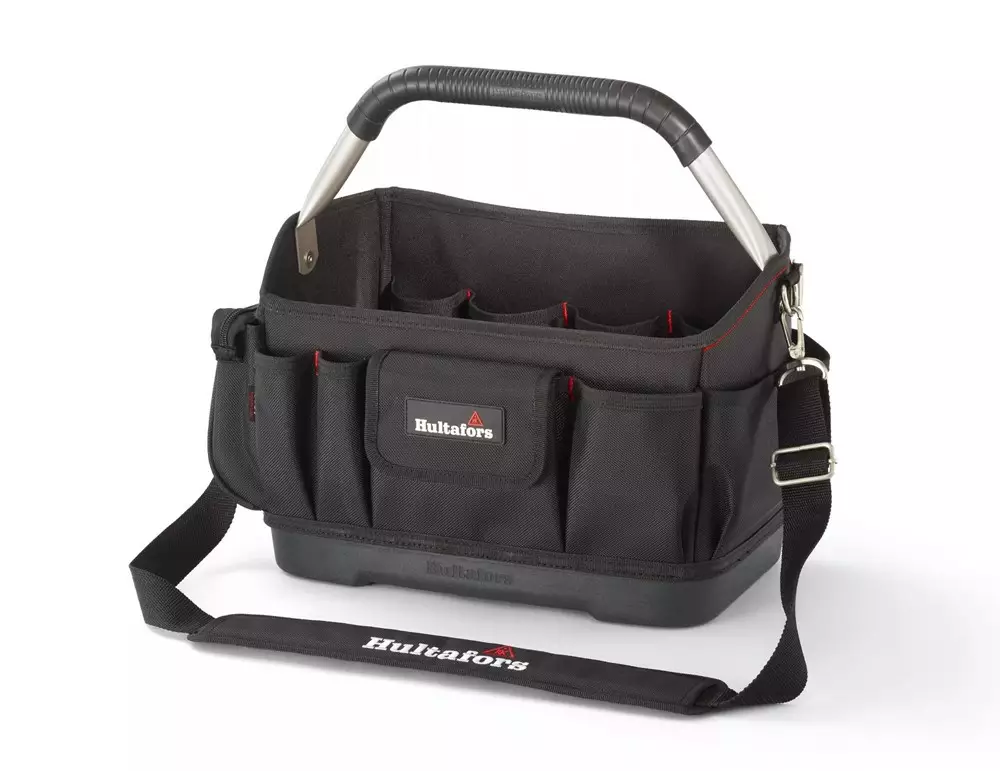 Avoin, pehmeäkylkinen työkalulaukku, joka on suunniteltu ergonomiseen kantamiseen. Laukun takaosa on ergonomisesti kaareva, jotta laukkua voi kantaa vaivattomasti lähellä vartaloa. Siinä on myös luja valettu pohja, joka estää laukkua kaatumasta, suojaa pohjaa kosteudelta, lialta ja kulumiselta – ja pitää työkalusi kuivina. Laukku on valmistettu erittäin kestävästä ballistisesta polyesteristä, jonka kestävyys on 1 680 denieriä, jolla saavutetaan paras mahdollinen kestävyys ja käyttöikä. Laukun etu- ja takaosa ovat eri korkuisia, jolloin näet työkalusi helposti ja pääset niihin käsiksi edestä. Siinä on suuri keskilokero, jossa on runsaasti taskuja sekä työkalupidikkeitä. Siinä on keskikokoisia läpällisiä ja vetoketjullisia taskuja herkkien laitteiden turvallista säilytystä varten. Siinä on myös pidike rullamitalle, kynänpidikkeitä, avainpidike ja joustavia lenkkejä pienemmille työkaluille. Yhdessä sivutaskussa on sade- ja pölysuoja. Se on valmistettu ripstop-kankaasta ja suojaa laukkua ja sen sisältöä huonolta säältä, pölyltä ja lialta. Kahva on erityisen korkea, mikä helpottaa laukun nostamista maasta. Siinä on pitkä kumipäällyste, joten voit tarttua kahvaan mukavasti sen koko matkalta ja tasapainottaa epätasaisesti lastattua laukkua. Kahva taittuu pois, jotta laukun sisältöä on helpompi tarkastella ja käyttää. Säädettävässä olkahihnassa on erittäin pitkä pehmuste, jonka liukumaton pinta takaa mukavan ja helpon kantamisen.