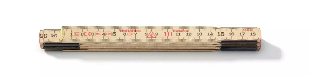Hultaforsin klassikko, ehdoton työkalu jokaiselle käsityötä tekevälle. Valmistetaan perinteisesti hieskoivusta, nivelet ruotsalaista terästä. Ohuttikkuinen ja kätevä mitta. Musta metrinen asteikko molemmilla puolilla, punaiset desimaalinumerot.