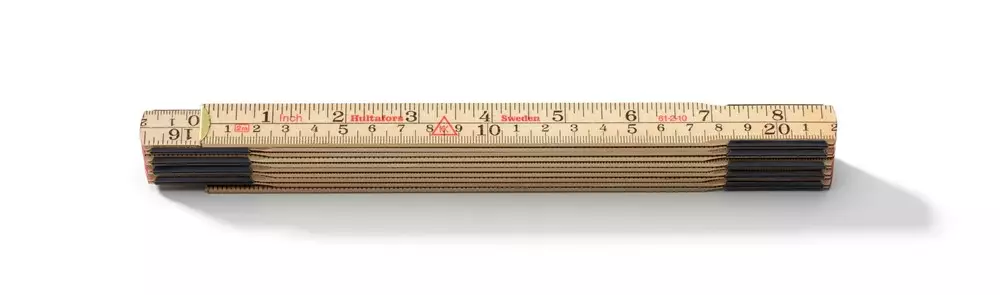 Klassinen hieskoivusta valmistettu nivelmitta, nivelet ruotsalaista terästä. Ohuttikkuinen ja kätevä mitta. Molemmilla puolilla mustat asteikot, mitan alareunassa metrinen asteikko ja yläreunassa englantilainen tuuma-asteikko.