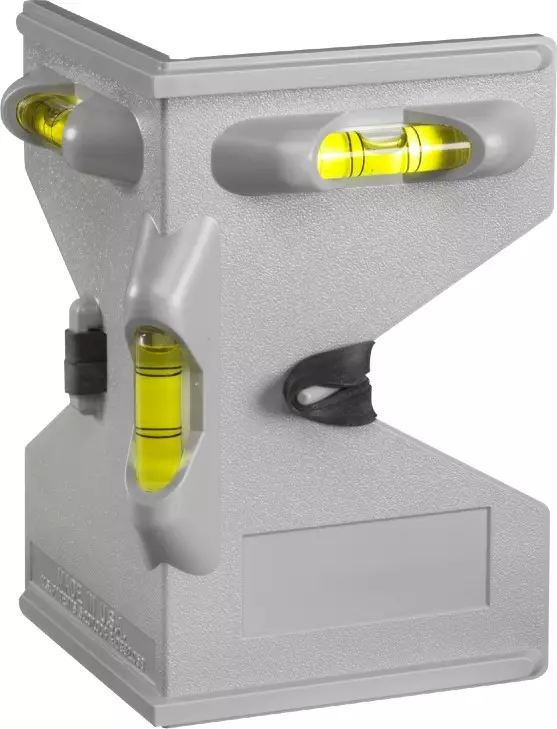 Iskunkestävästä ABS-muovista valmistettu tolppavatupassi, jossa on kolme särkymätöntä putkilibelliä sekä pysty- ja vaakasuoruuden tarkastamiseen.